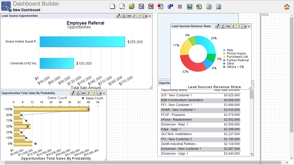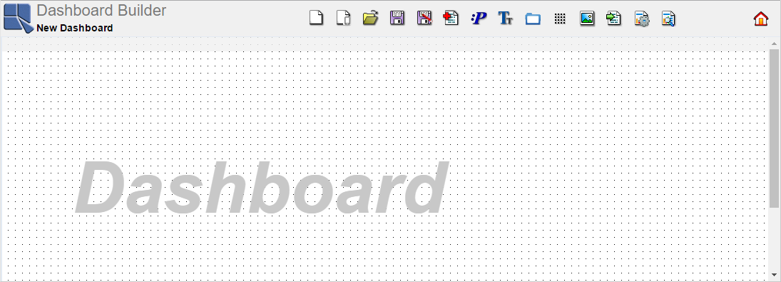 The top part of the Dashboard Builder interface contains a small toolbar that allows you to initiate the following actions: