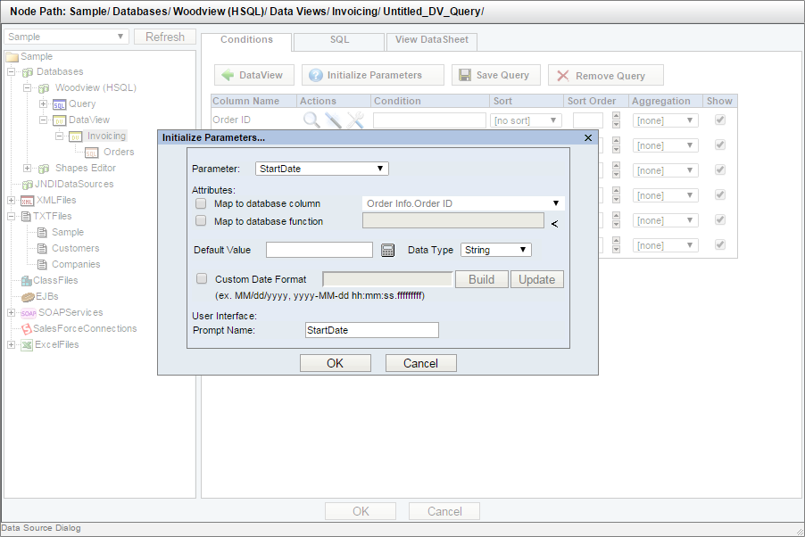 Data Source Dialog also allows you to define query parameters. Parameters are defined in the same way as with other query interfaces - using the ":" character. You can define parameters directly in the conditions field, using the convention of :ParameterName to define a parameter.
