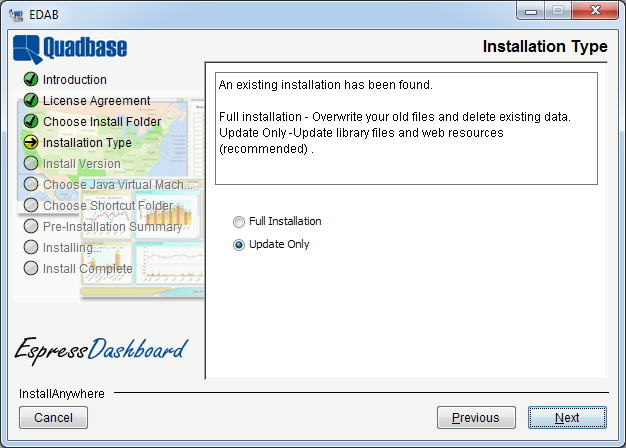 If the directory already exists and contains an installation of EDAB, the installer will give you the option to perform a full or update install. If the directory doesn't contain EDAB, the installation will always be a full install. For more information about update installs please see Section 1.3.1.1 - Re-Install/Update.