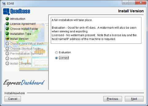 For full installs, the next step will ask you whether you would like to install the evaluation or release version. The evaluation version is fully functional. However, there will be a water mark on any report, chart, map, and dashboard and the license will expire in 45 days. For update installs, it will always use an evaluation license. Please visit https://www.quadbase.com/register/ to get the full license.