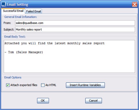 The first tab is called Successful email and it allows you to set an email message which will be sent in case the scheduled task finished with no problems.