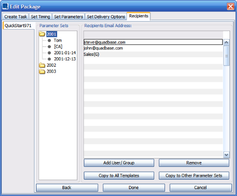 If you want to send all parameter sets or all templates to the same recipients, you don't have to add the recipients manually into all parameter sets and templates. Just add the recipients into one recipients list and then use one of the following buttons: