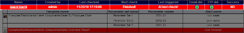 Each task has a Success indicator which is not to be confused with triggered/not triggered alerts. The indicator tells whether the last check was performed successfully. There are a few things that can go wrong during checks - monitored templates or alerts could have been renamed or removed, one of the delivery options (FTP or Email delivery) may have failed because of network problem... If a check has failed, the Success indicator will look like this: