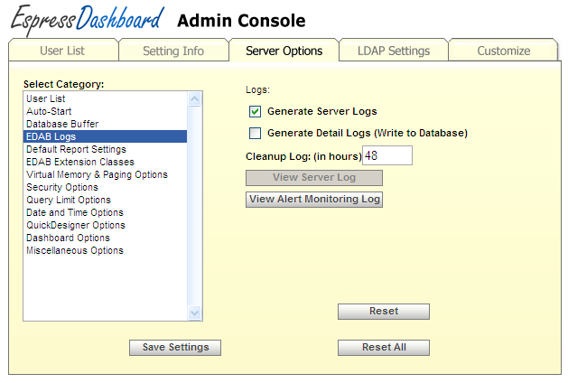 To open the monitoring log, log in as admin and click Admin Console. Then go to the Server option tab, select EDAB logs category and click the button.