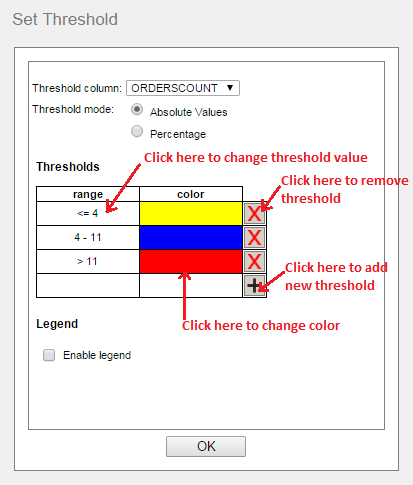 Thresholds allow you to differentiate areas by color based on value in a particular data source column. If a threshold is set, all the map areas (i.e. objects with a record in the map data source) are colored with color assigned to the appropriate value range.