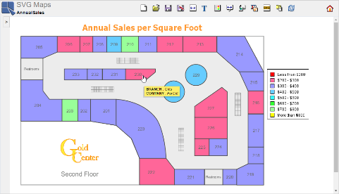 Let's take a look at the following example of a shopping center with three floors. We want to display the status of annual sales per square foot of stores. Open SVG Maps designer (from the EDAB main page) and click the