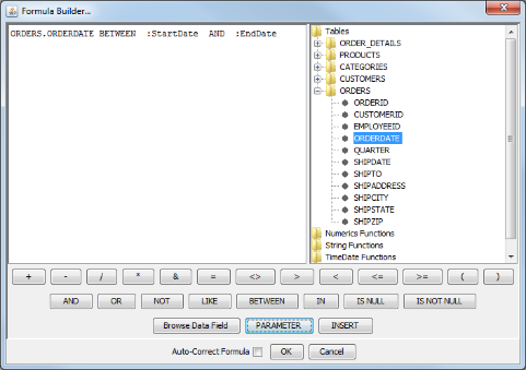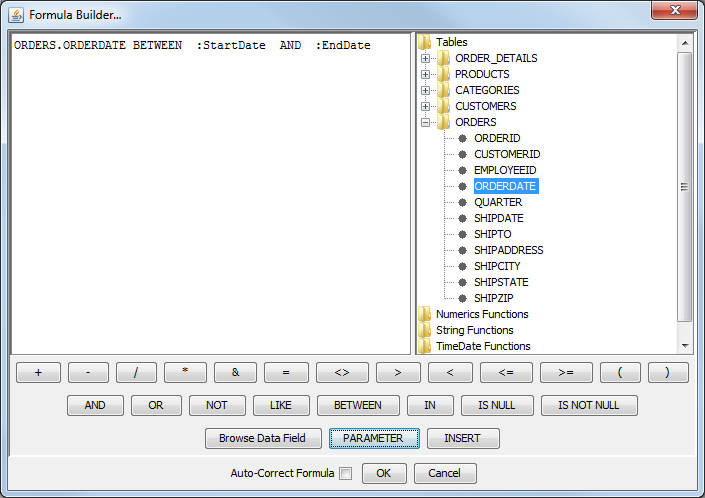 Double click on the Tables folder within the Formula Builder to expand it. Then expand the ORDERS node and double click on the ORDERDATE field. Next click the button and then click the button. This will bring up a dialog prompting you specify a name for the query parameter.