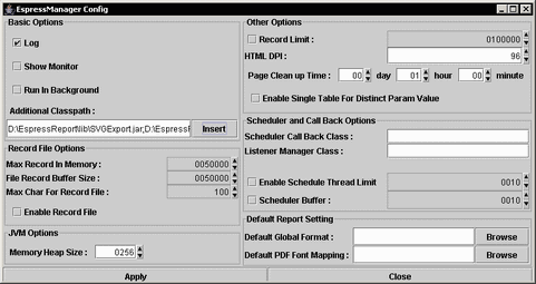 Many of the EspressManager configuration features highlighted in the previous section can also be set using a stand-along EspressManager configuration interface provided with EspressReport. To launch the interface, make sure the EspressManager is not running, then execute ManagerConfig.bat/.sh. A configuration window will open.