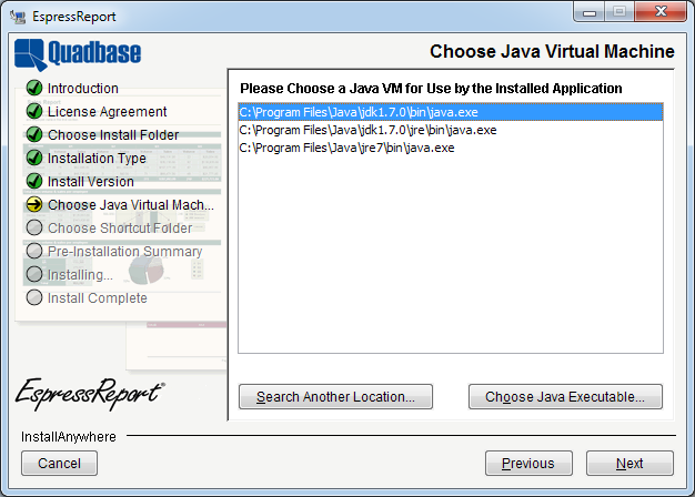 The next window allows you to specify which Java Virtual Machine version should be used to run EspressReport. (Since it is a Java program, you will need JVM to run it.)