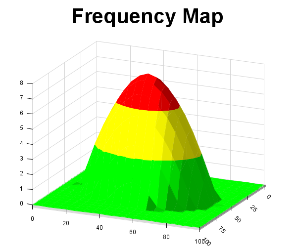 The code above creates a 3D surface chart with 3 color sections, green, yellow and red. The threshold values determining the colors are 3 and 6.