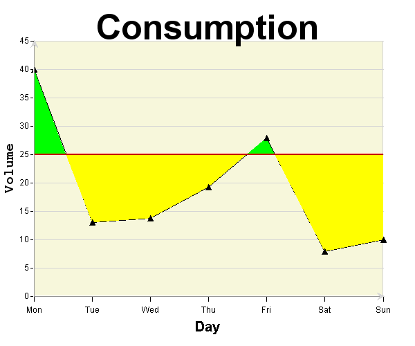 EspressReport allows you to create line areas between a horizontal line and the data line to denote the change. For example, you could have a horizontal line at 25 and a data line. All areas enclosed by the data line and horizontal line and above the horizontal line can be one color and all areas enclosed by the horizontal line and data line and below the horizontal line can be another color. Please note that this feature is only available for 2D Line charts with no series. Also note that you need to set the color above and below the horizontal line in order to use this feature.