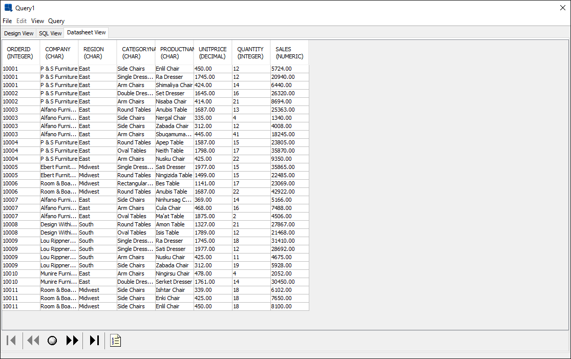 Once you finish adding the fields, click the button. This will bring up a new window which enables you to set conditions, grouping, and ordering for the query. Like the Query Builder, this window also allows you to preview the query result with the Datasheet View tab.
