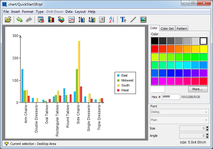 To modify colors of the chart elements, you can use one of the preset “Color Sets”. Click on the Color Set tab in the right side of the Chart Designer window and choose any color set. This will apply the color set for the data elements. You can also change the color for any element by clicking on it to select it (hint: the Design window will indicate the currently selected element at the lower left corner) and picking a new color from the color panel.