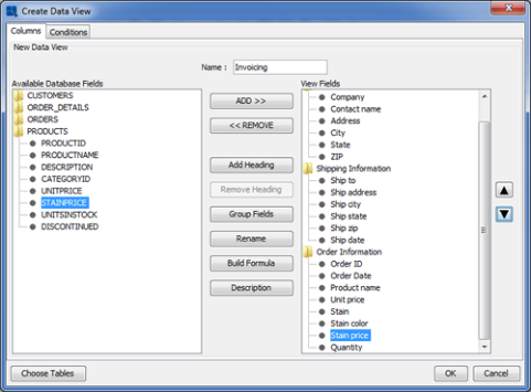 In the Data Source Manager, select the Invoicing data view. Then click the button. This will open a dialog prompting you to select fields from the view. To select fields, first double click on a heading to expand it. Add the following fields to the query by selecting them and clicking the button: