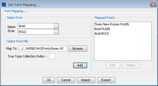 You can select a specific .ttf, .ttc, .pfb, or .afm file for each font and style combination. You can either type the full path or browse to the font file. If you are using a .ttc file, you will need to specify the font index in the box provided (.ttc files contain more than one font). Once you specify the correct file, click the button to save the mapping to the list. You can edit or delete existing mappings by selecting them in the list and clicking the appropriate button.