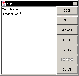 From this dialog, you can edit an existing script, create a new script, rename a script, delete a script, apply a script to the current element, and remove a script from the current element. If a script is being used, it can still be deleted (a message will appear asking if it is ok to proceed) and the script is first removed from any cell before being deleted. If the script is used by a security level, the script has to be removed manually first before it can be deleted. To apply a script to the currently selected report element, select a script from the list and click the Apply button. The script list will close and the script will be applied.