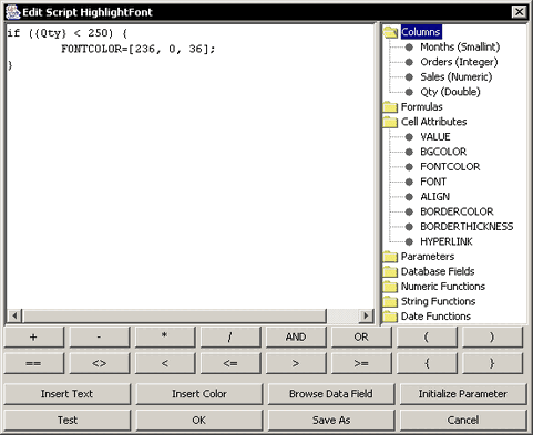 Cell scripting or conditional formatting allows you to dynamically modify certain object properties when specific conditions are met. Scripting allows you to highlight certain data values and to present a report that is easier to read. A simple example of this would be a report showing financial results or cash flows. Scripting could be applied to a column field so that negative numbers are shown in red, dynamically highlighting areas of revenue or cash shortages.