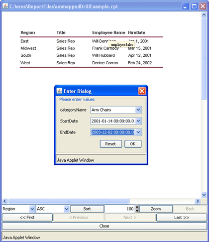 When viewing a report with unmapped drill-down parameters, clicking on the links in the main report will cause a parameter selection dialog to pop up, allowing you to fill in the unmapped parameters.