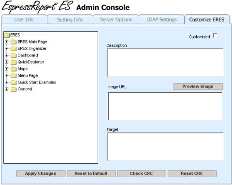 The left window provides a tree of the different elements that can be customized. The customizable elements are broken up into sections based on the components in the ERES application. Most sections contain three types of elements: images, text, and CSS files. By clicking on an image element, the page will display the description, an image URL, and a target URL if available. You can change the image file by providing a different URL. Clicking on the button will display the image at the bottom of the screen. The preview window is only available for images, clicking on a text or CSS element will disable the preview window. The target URL is only available for certain elements. If the selected element allows for a target to be set, this text box will appear beneath the image URL box. Enter a URL in this window if you would like to add a hyperlink for this image. If this link is provided, when users click on the image, the browser will be redirected to the target URL.