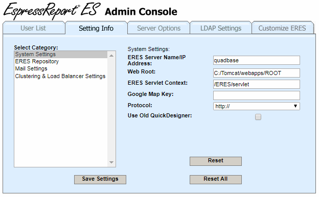 The Setting Info tab contains configurations and settings critical to the way ERES functions.