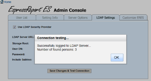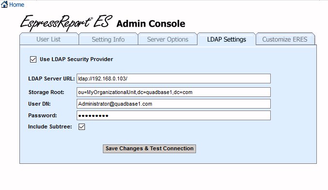 In order to connect with ERES you will need to have an user in your LDAP server that can read from the Active Directory. Enter the user's distinguished name in to the User DN field and then type the user's password to the Password field.