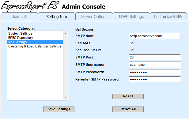 Mail Settings allow you to specify the SMTP information that ERES will use when sending scheduled e-mails to users.