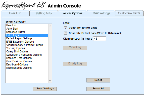 The Generate Server Logs option allows you to turn on/off the ERES Server logs. When this option is enabled, ERES writes a log file on the server-side that monitor the ERES installation. ERESServer.log monitors all of the client-server communitcation for the system, as well as the report generation. Any errors or exceptions are printed.