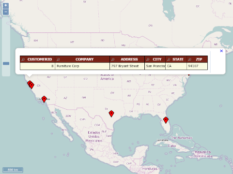 If all the drilldown parameters are multi-value (see Section 4.1.2.2.2.1 - Multi-Value Parameters), you will be allowed to select multiple map markers at once. For example, you can use Examples/QuickStart/QuickStart Maps/MultiValue data source, map MULTIVALUE parameter to STATE column, and then click .