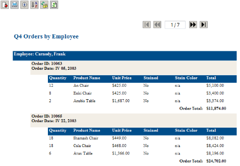 The main window also contains a page navigator that contains first page, previous page, next page, last page buttons and a textbox that allows you to jump to any specific page number. The textbox displays the current page number in the form <Current Page Number> / <Total Page Number>. To jump to a specific page, simply type the page number into the textbox and press Enter. You can also enter the value in the same fractional format that is used in the display. For example, to jump to page 7 of a 22 page report, you can enter 7 or 7 / 22.