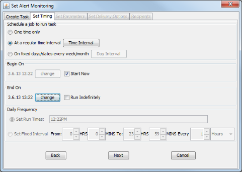You should be on the Set Timing tab now. By default, the alerts would be checked just once, few minutes after configuring it. Select the At a regular time interval option. Set Time Interval dialog should show up. Default time interval is 1 minute, which is fine for us, so just click to confirm it. Uncheck the Run Indefinitely checkbox and click the button right next to it. Set the end time one hour to the future (so you do not have to delete the job manually after you are done with this QuickStart chapter) and click . The dialog should look like this: