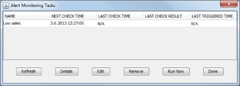 The Low sales task should be on the list. Check the Last check time value. If no check was performed until now, it will show N/A. You can either wait for next automatic check (look at the Next check time if you want to know when that's going to happen) and then click . You can also select the Low sales task and click and then click .