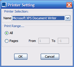 The first drop-down dialog contains a list of all the available system and network printers. You can select which one you would like to use. The second option allows you to select a page range for printing. You can print all of the pages or set a specific range. -1 represents the last page. Example, if you want to print all of the pages except for the first one, set the range to From 2 , To -1.